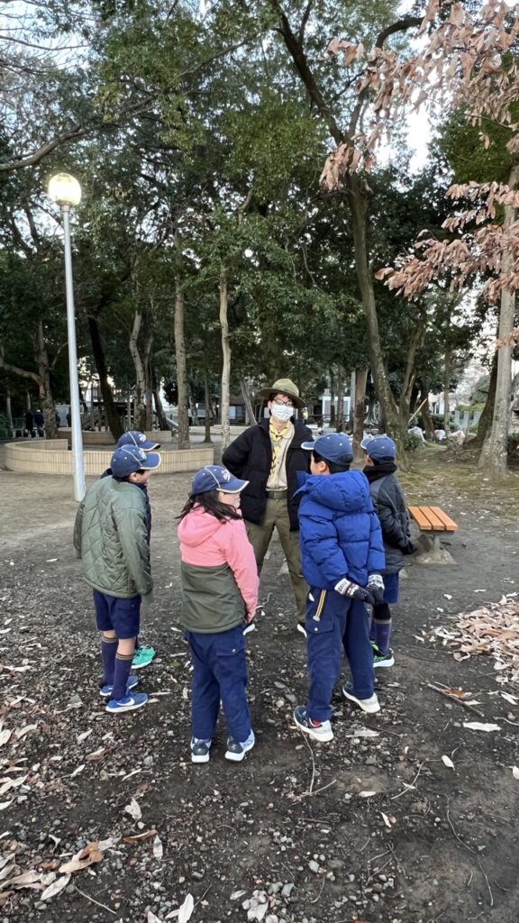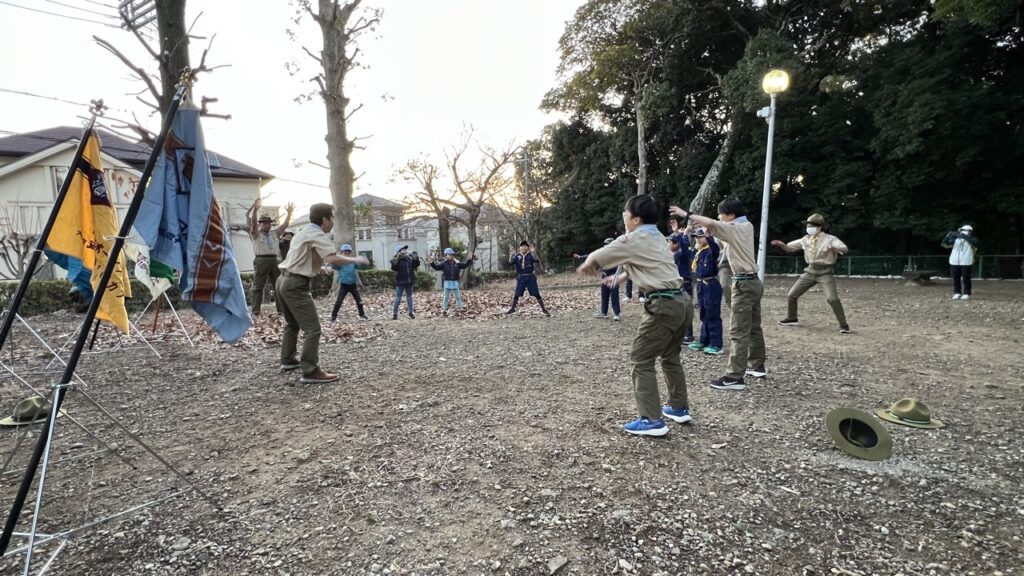 当日は、育成会長からの挨拶、団委員長からの挨拶があり、参加者全員で新年の挨拶を交わしました。その後、連盟歌を歌い、次によいしょ!よいしょ!と掛け声と共にしゃがんで立つを繰り返す「天突き体操」を行い、体を動かしました。